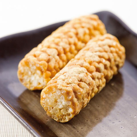 もち米で作ったあられを水あめで固めた丸い棒状のお菓子は食感もよく、さくっとしています。水あめの粘りけが後味を引きます。